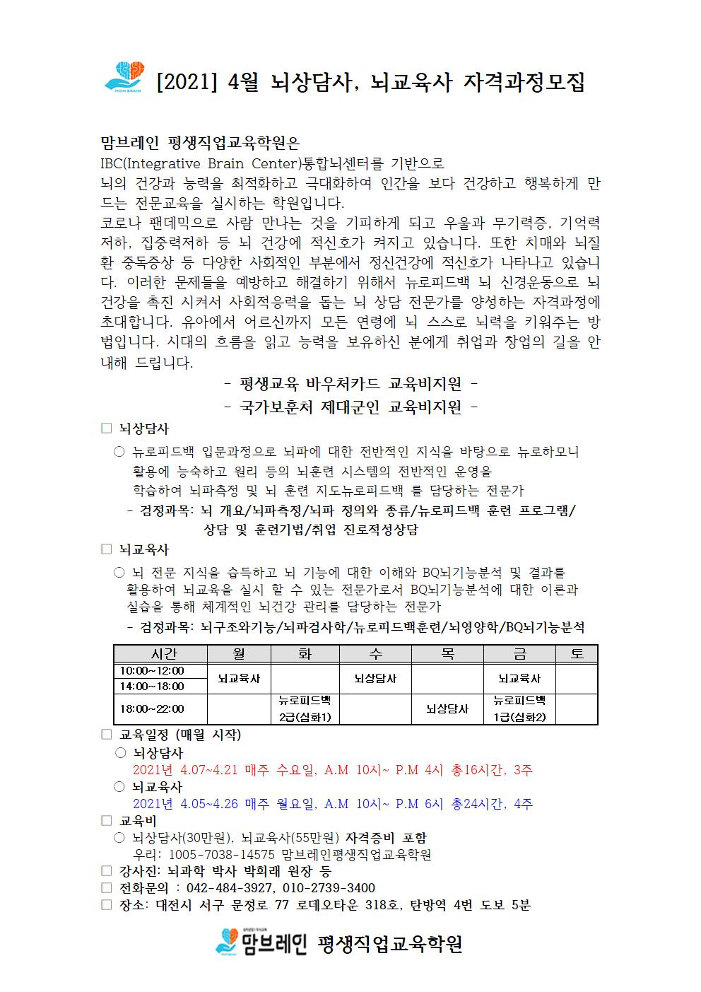 [2021] 4월 뇌상담사, 뇌교육사 자격과정모집